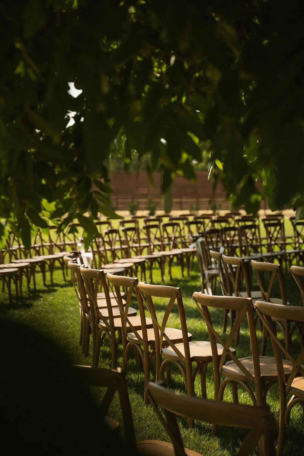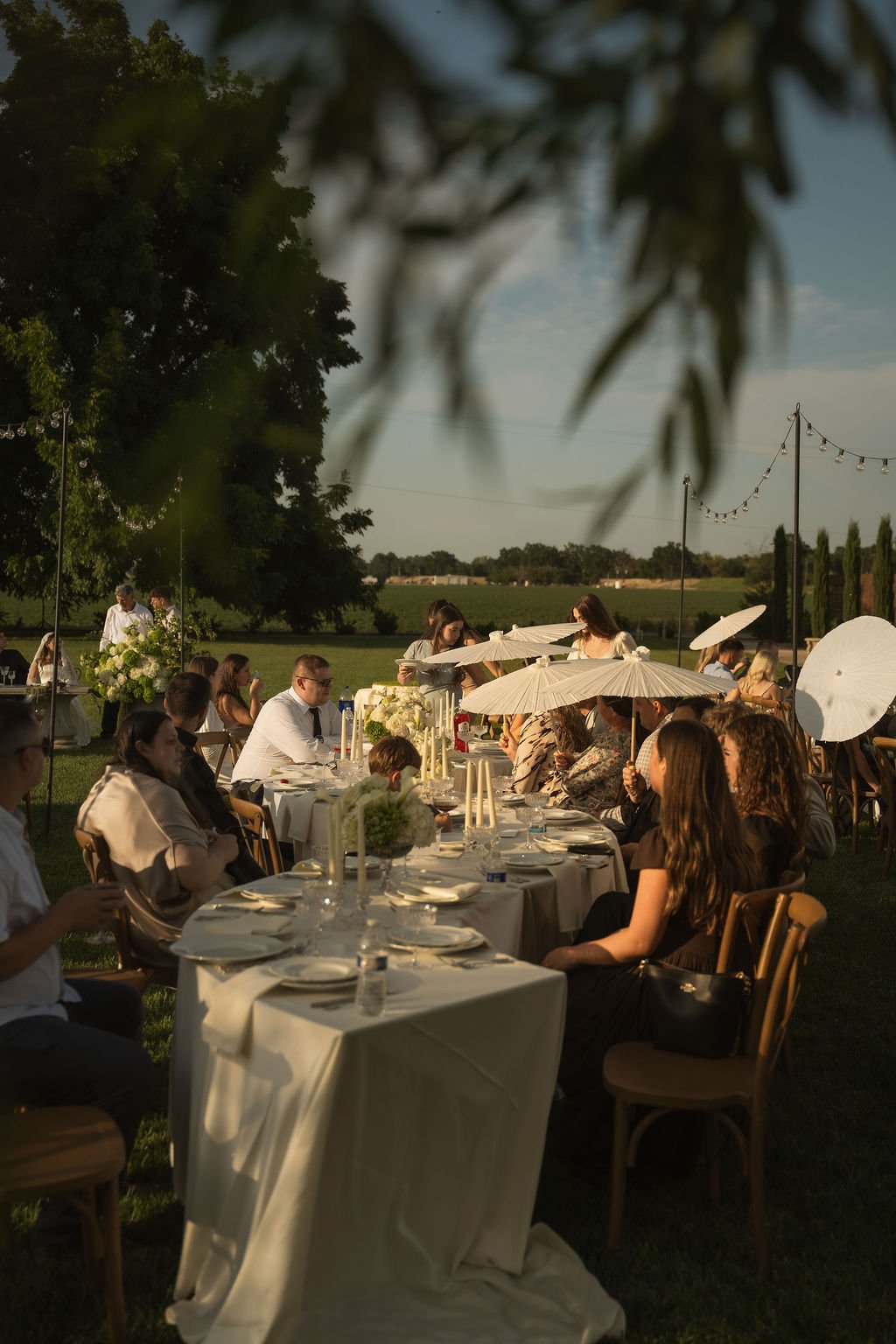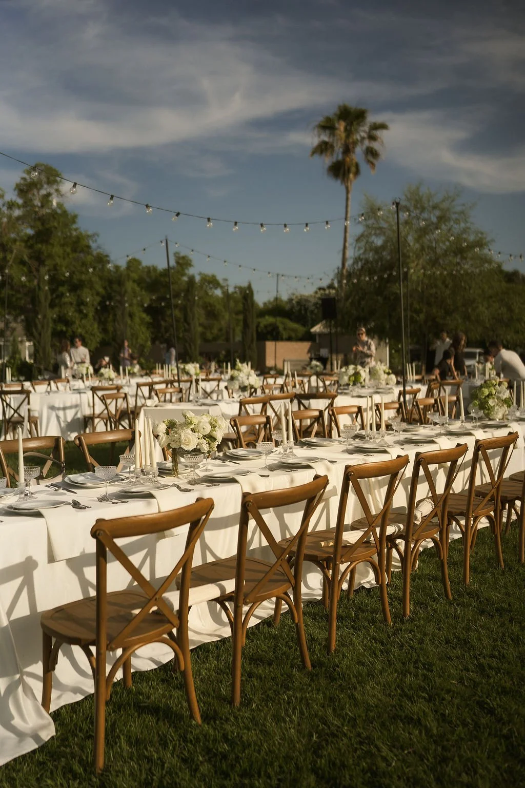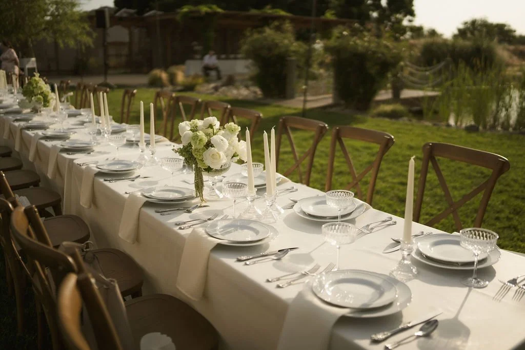 As the sun dipped lower, the space transformed for the reception. Serpentine tables curved gracefully across the lawn, creating a warm, communal atmosphere that invited conversation and connection. Brown wooden crossback chairs added a vintage, old-world charm, grounding the design with texture and warmth. The flowing table layout paired beautifully with the estate’s open landscape, striking the perfect balance between elegance and ease.